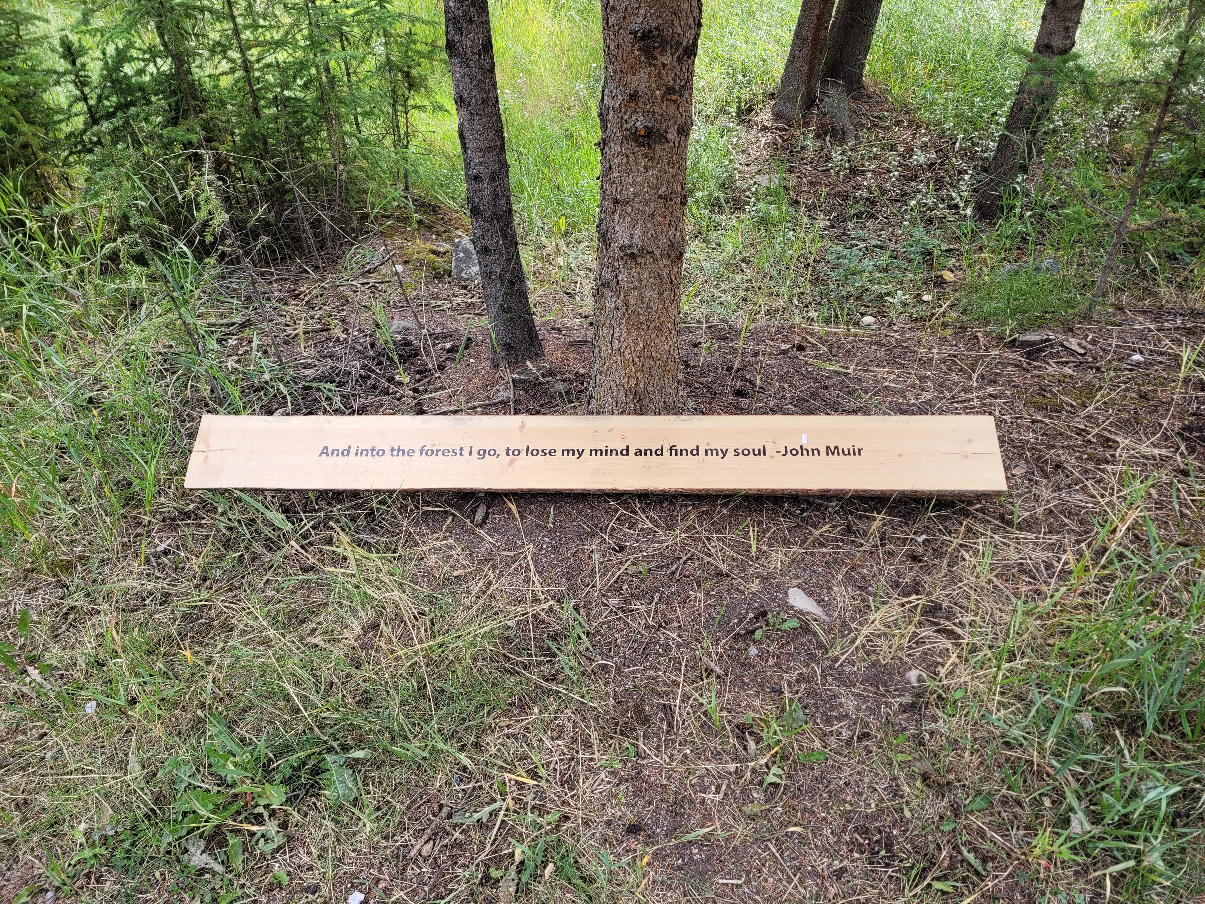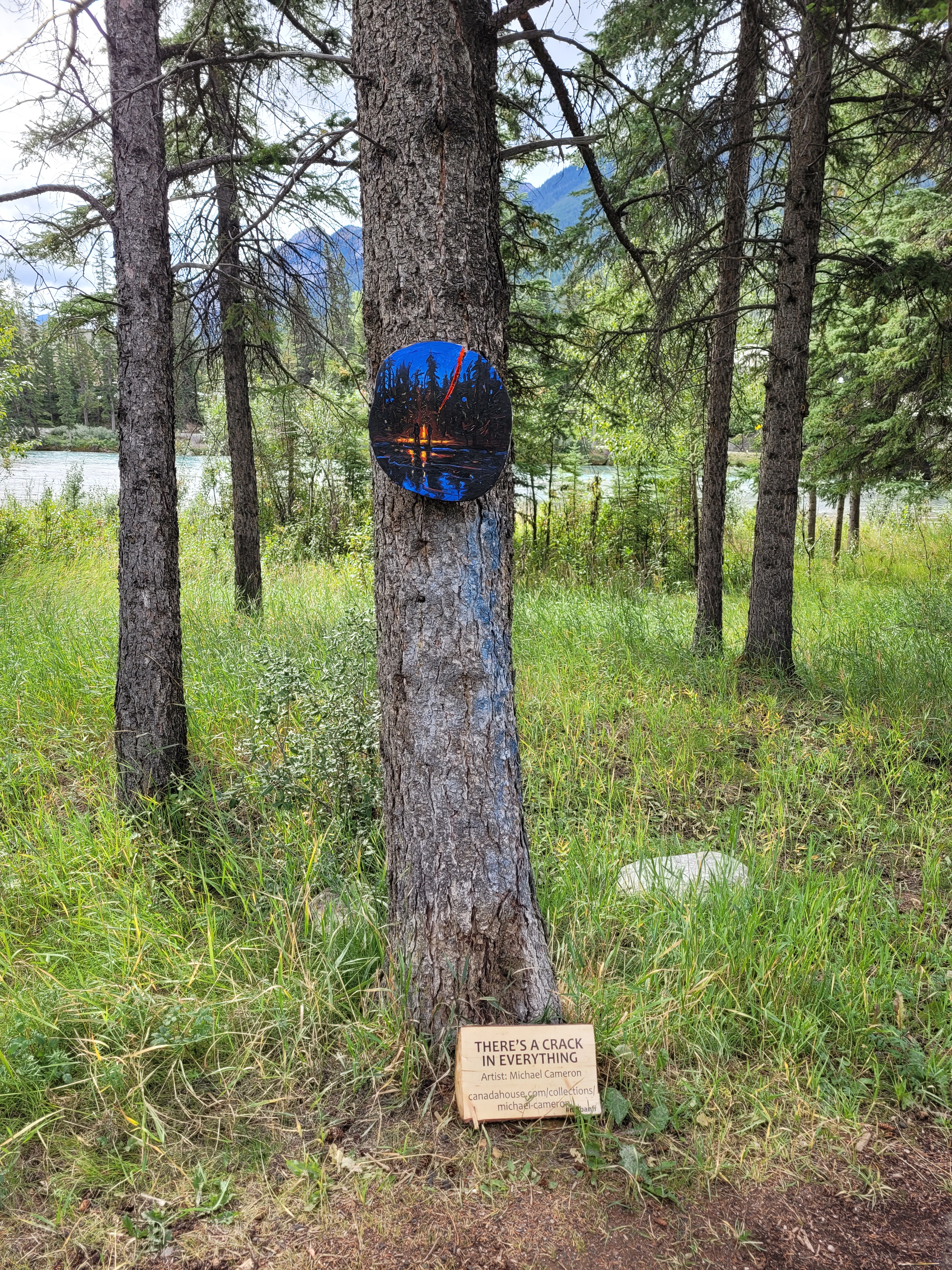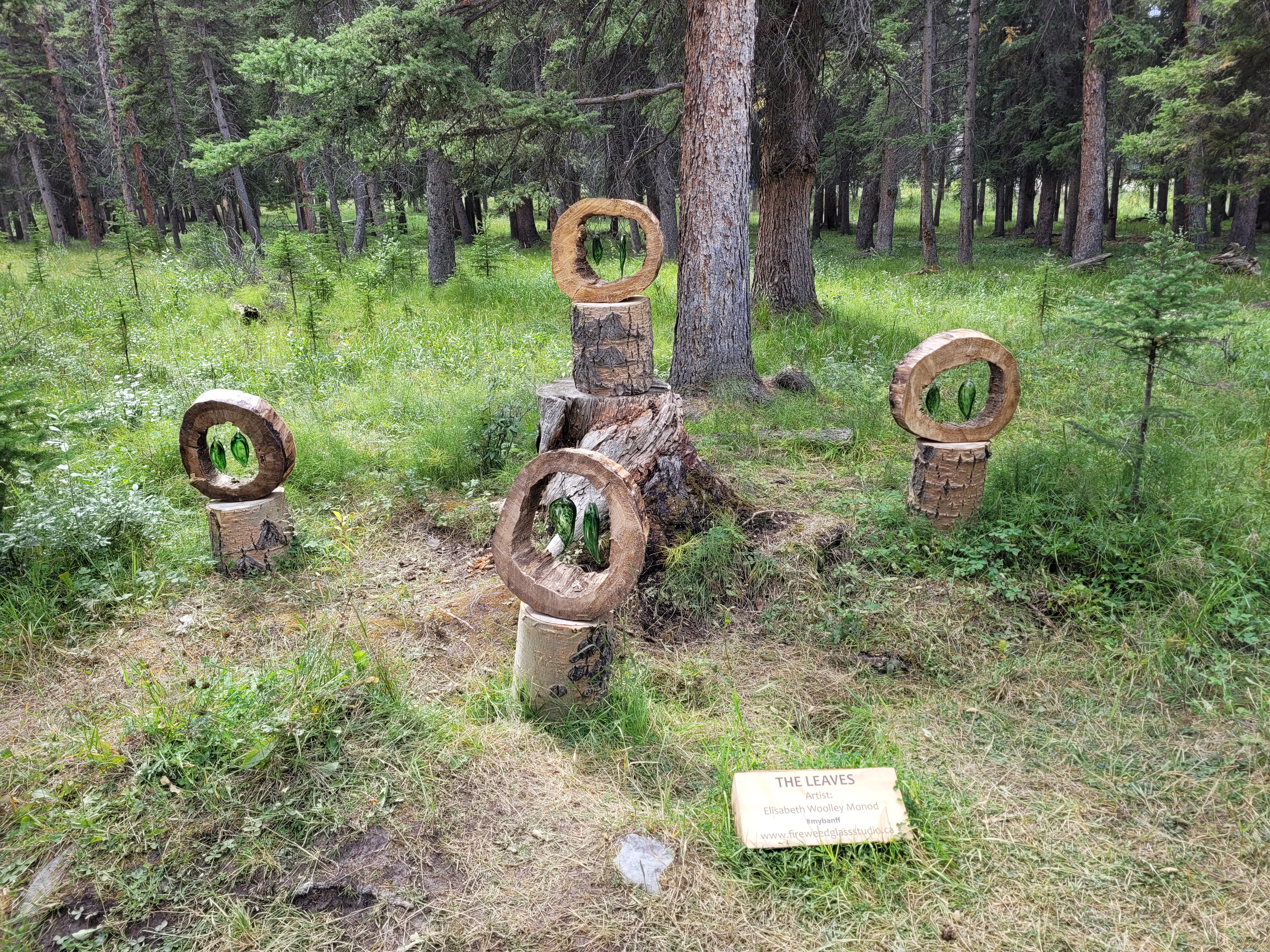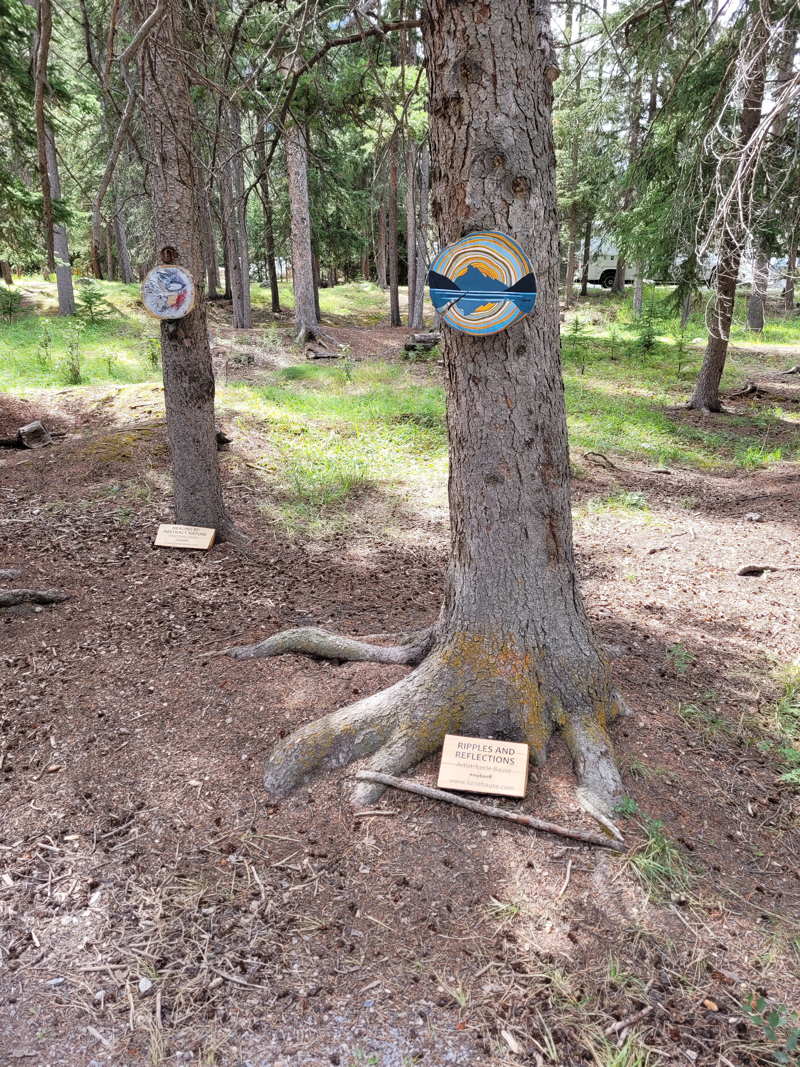Leaving the Icefields, we drove through a snow storm! In August! It was still drizzling when we arrived in Banff, but we hurried to set up the camper, have a snack, and drove to the Hot Springs. We managed to get in just before they closed and enjoyed a lovely soak, which was fortunate since they were going to be closed for the remainder of our stay in Banff. We spent the rest of our time in Banff doing some hiking and sightseeing. One of the hikes took us on a lovely “Art in Nature” walk, which featured pieces by local artists.