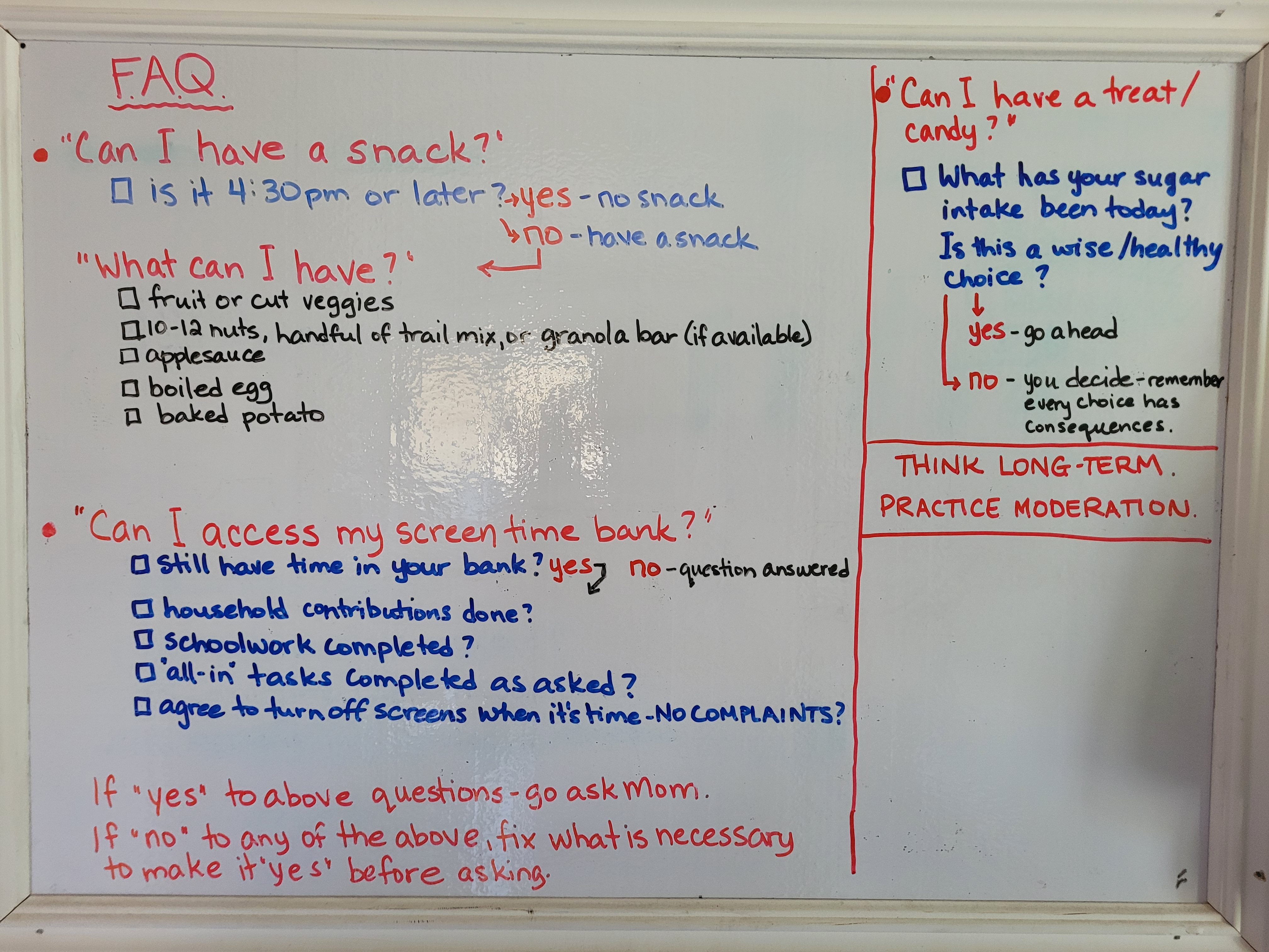 One of the things that I received a lot of questions about was our FAQ board. Something that we are trying really hard to teach our kids is to think and make good choices for themselves and to remember things that they have been told previously. So, the FAQ board was born. This is by no means an exhaustive list, but if I had to pick the questions that I am asked the most on any given day, these are at the top! The board is there to help guide and remind.