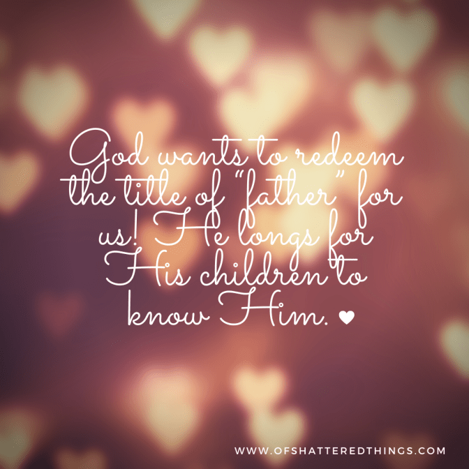 Perhaps the question we should be asking is, “Have I allowed my experiences with my earthly father to colour my view of God as Heavenly Father?” And if the answer is yes, then our prayer should be, “Lord, open my eyes to see.” God wants to redeem the title of “father” for us! He longs for His children to know Him. That’s why He sent Emmanuel, God with us, so that we could see Who He is and how much He loves us.