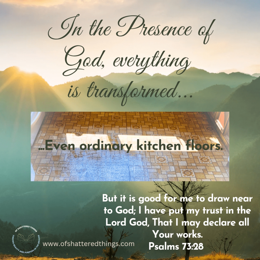 And as His presence swept into the room and the floor was watered with my tears, an unpleasant task transformed into an act of worship. The mundane became sacred. My kitchen floor, Holy ground. And I was overwhelmed with the wonder of Him.